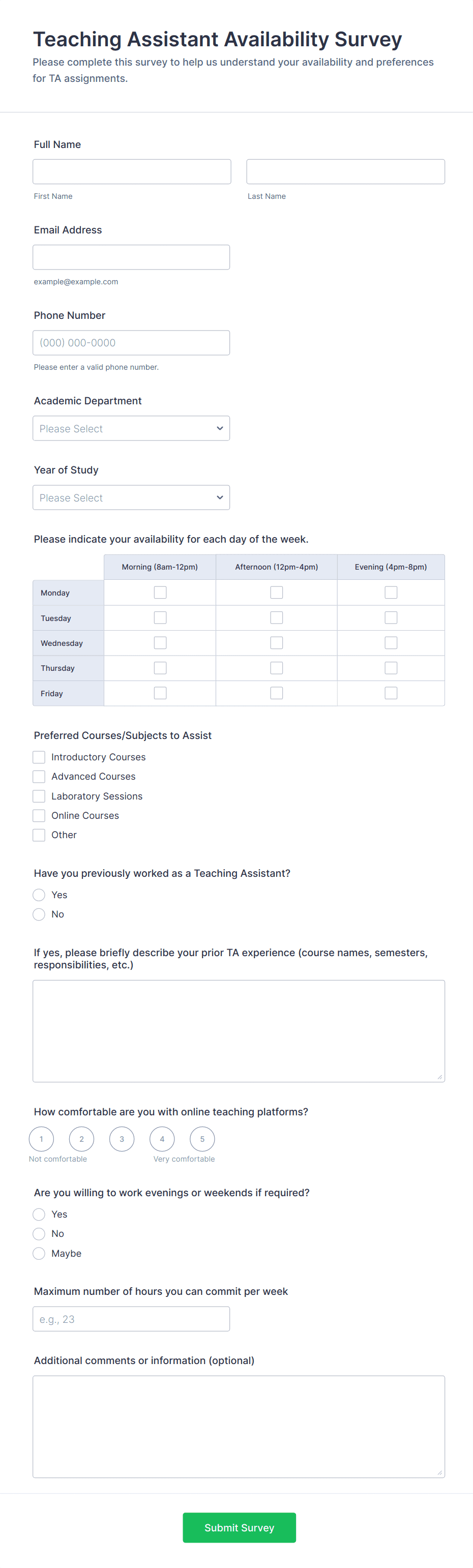 • Student Surveys: Focus on course content, teaching style, and classroom environment. May include rating scales, open-ended questions, and demographic fields.