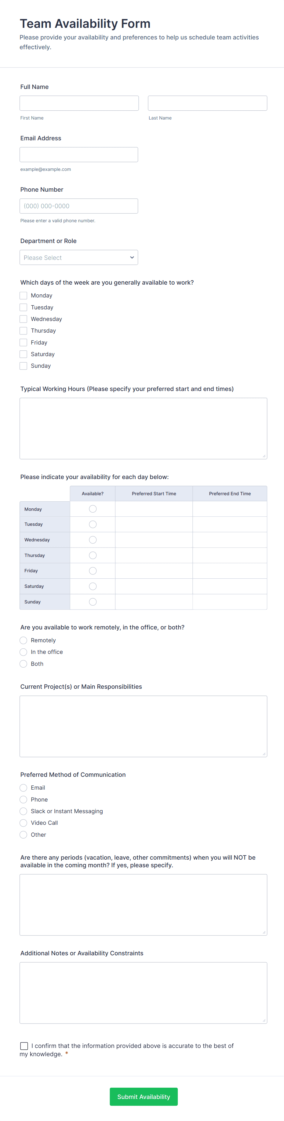 You can create an HR form in minutes with one of Jotform’s free templates! Simply navigate to our template directory and choose a template that works best for your needs. Once you’re finished customizing the template in our intuitive online form builder, you can share it with your employees via email, a link, or a QR code so they can fill it out instantly.