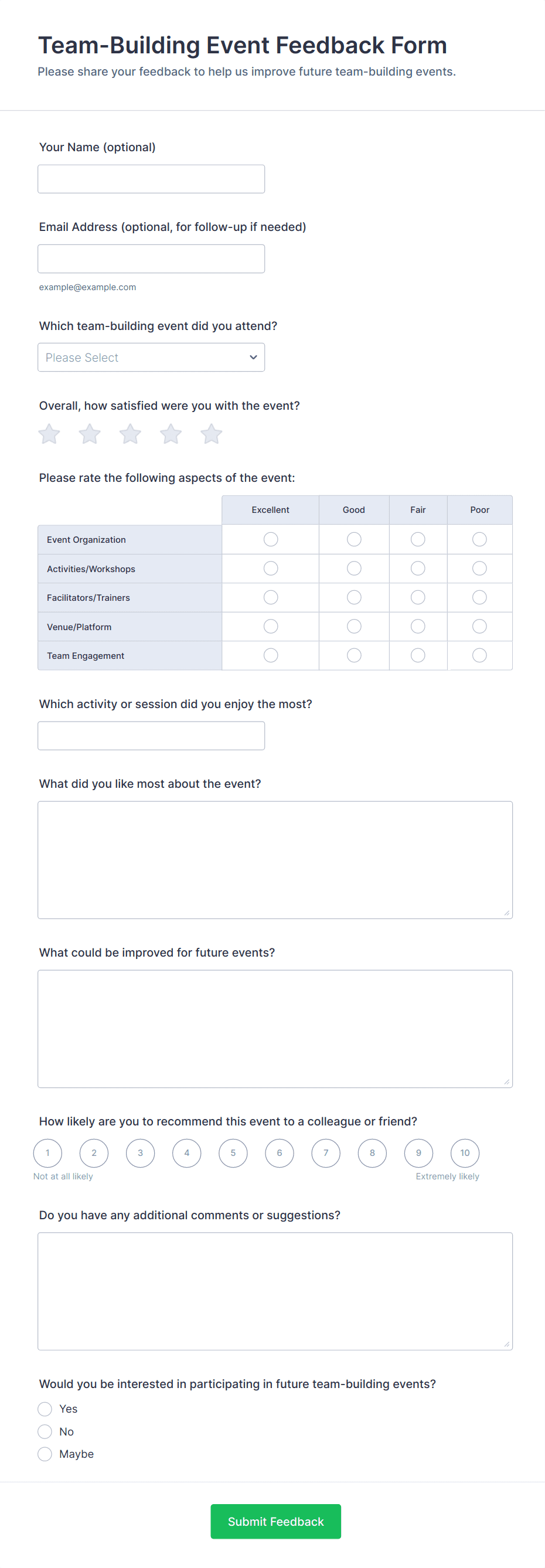 • Content and fields may vary based on event type; for example, a conference feedback form might include session ratings, while a social event form may focus on food, entertainment, and atmosphere.