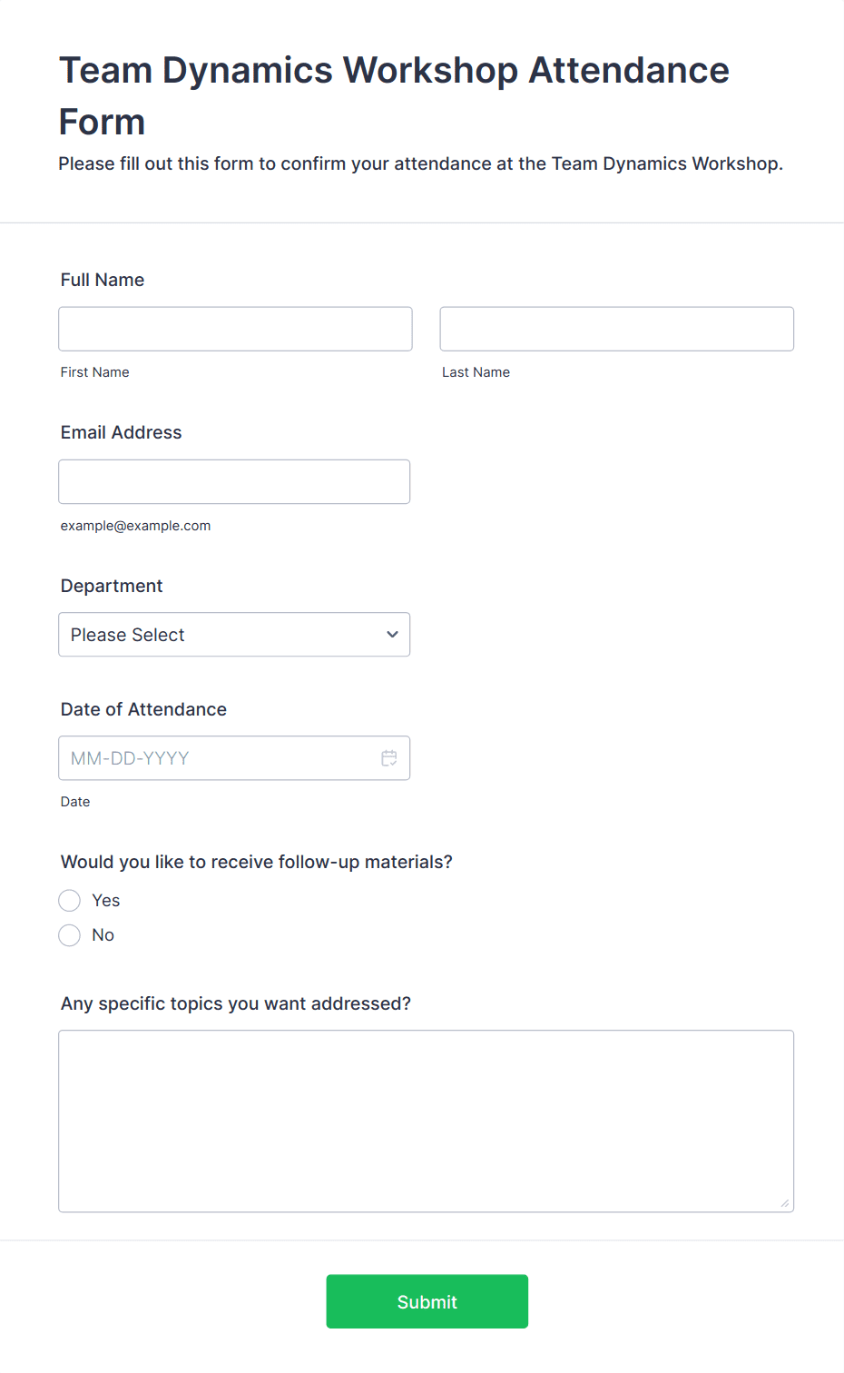 Take attendance for your next workshop online. Free attendance form template for workshops. Easy to customize, embed, and fill out on any device. No coding.