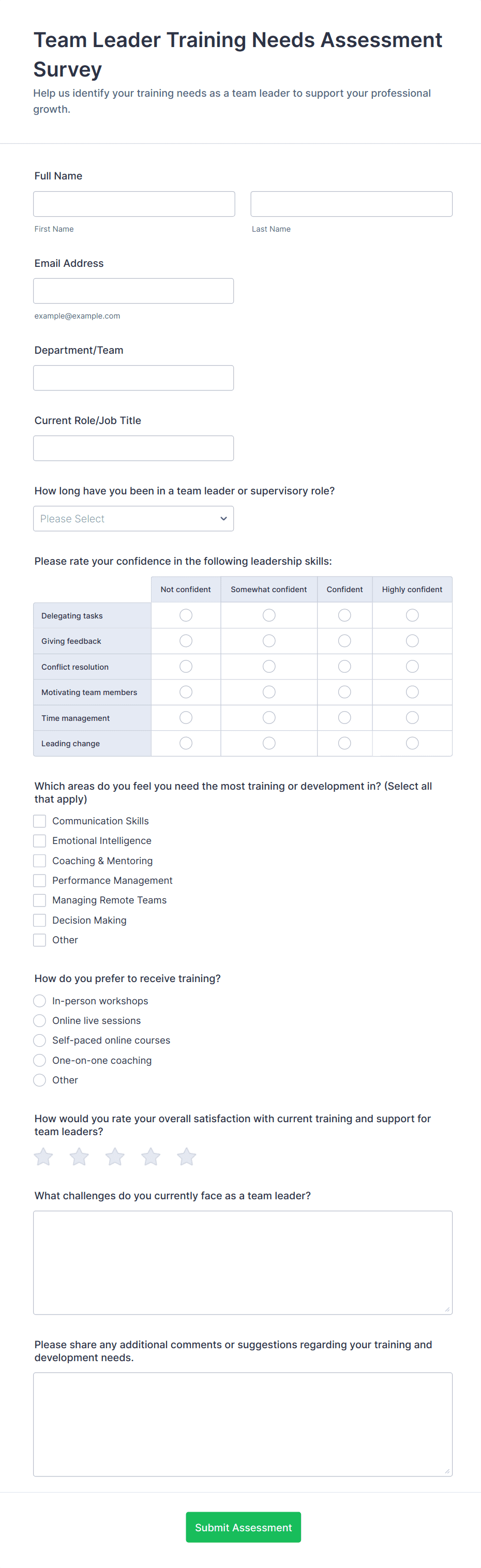 • Pre-Training Needs Assessment: Gauge existing knowledge levels and learning objectives before a training session to tailor content accordingly.