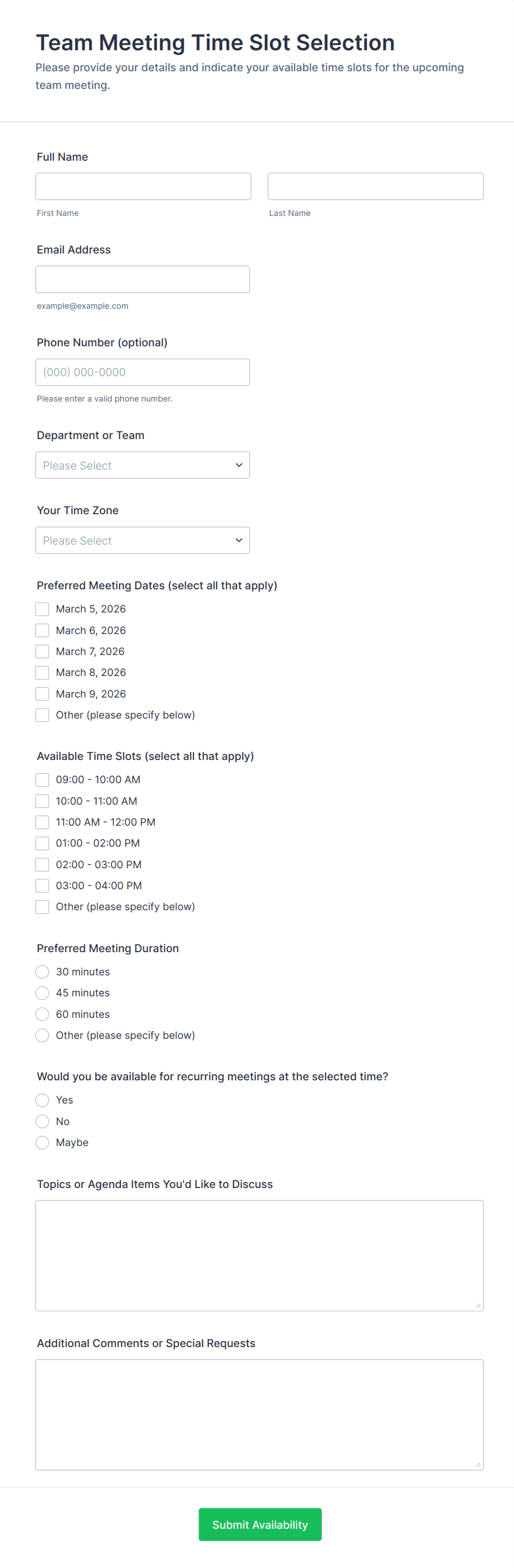 A meeting form is an online tool used to organize, schedule, and manage meetings by collecting essential information such as attendee details, agenda items, and feedback.