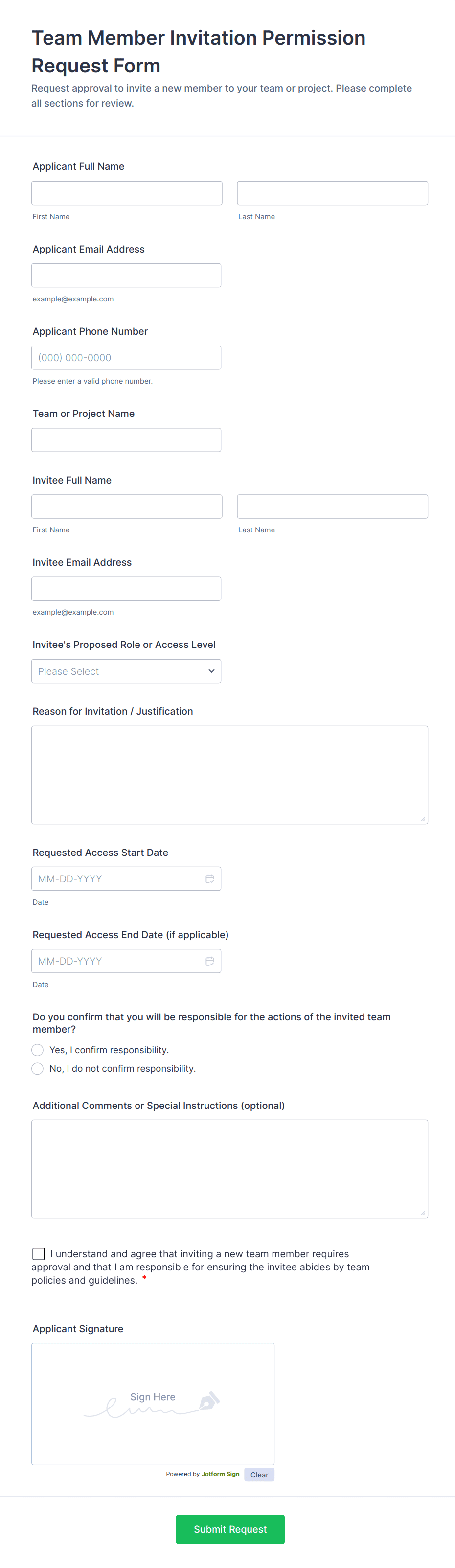 Access control forms are structured documents used to request, approve, and document access to physical locations, systems, or restricted resources. They help organizations manage who can enter certain areas, use specific equipment, or access sensitive digital systems by collecting consistent details such as requester identity, access level, justification, and approval records. Access control forms are commonly used in offices, campuses, data centers, hospitals, warehouses, and IT environments for badge requests, visitor access, temporary passes, role-based system access, and permission changes. By standardizing access requests, these forms reduce security risks, improve accountability, and create clear audit trails.