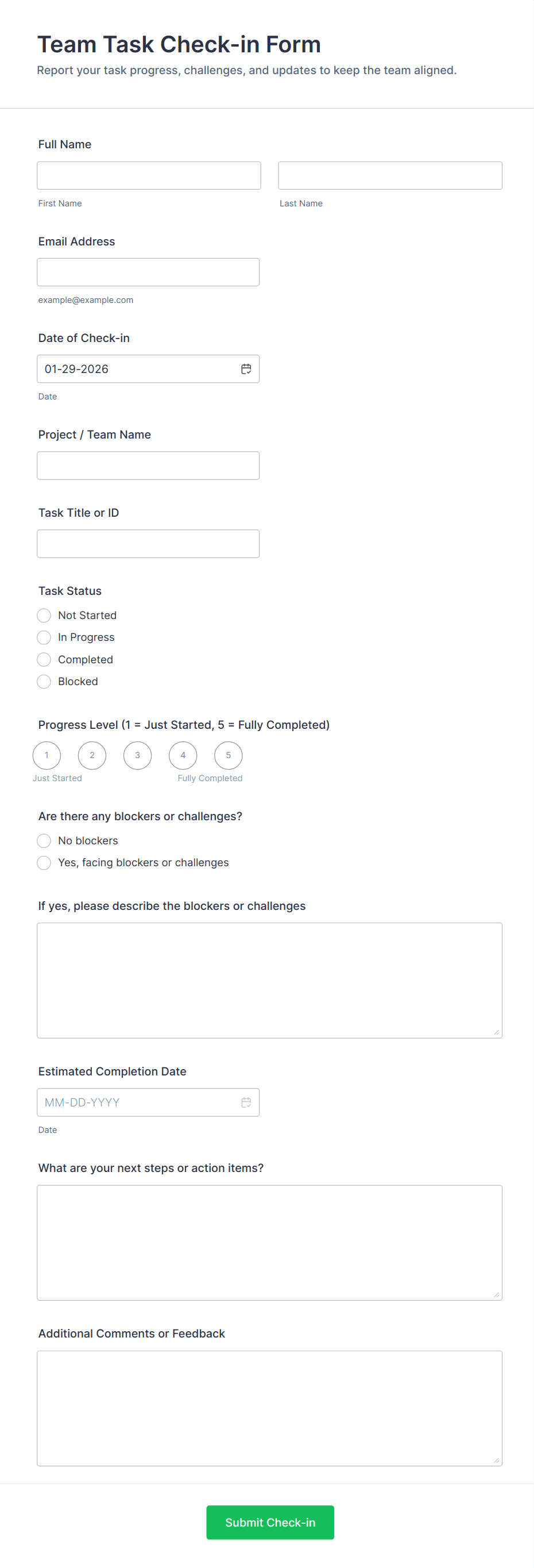 Check-In Form Templates are digital forms designed to streamline the process of recording arrivals and departures for a variety of settings, such as events, appointments, workplaces, schools, hotels, and healthcare facilities. These templates help organizations efficiently track attendance, monitor visitor flow, and collect essential information from guests, employees, or participants. Whether you’re managing a conference, coordinating patient visits, or overseeing daily employee attendance, check-in forms provide a structured and professional way to gather and organize data, ensuring a smooth and secure check-in experience for everyone involved.