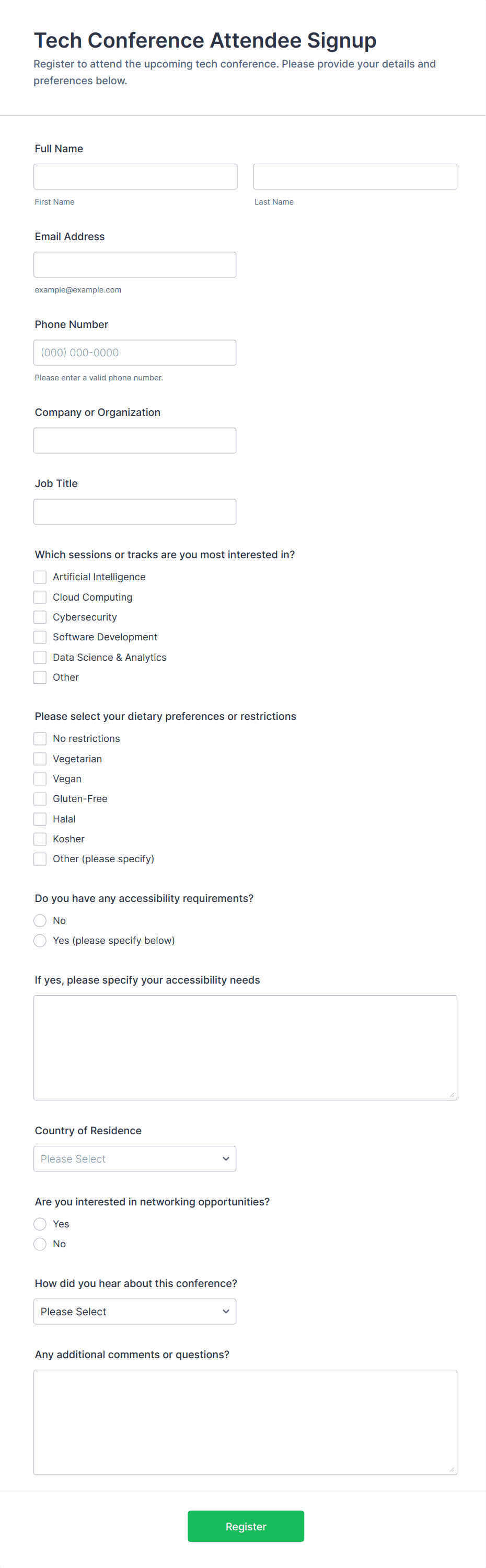 - Session or Workshop Selection (dropdowns or checkboxes)