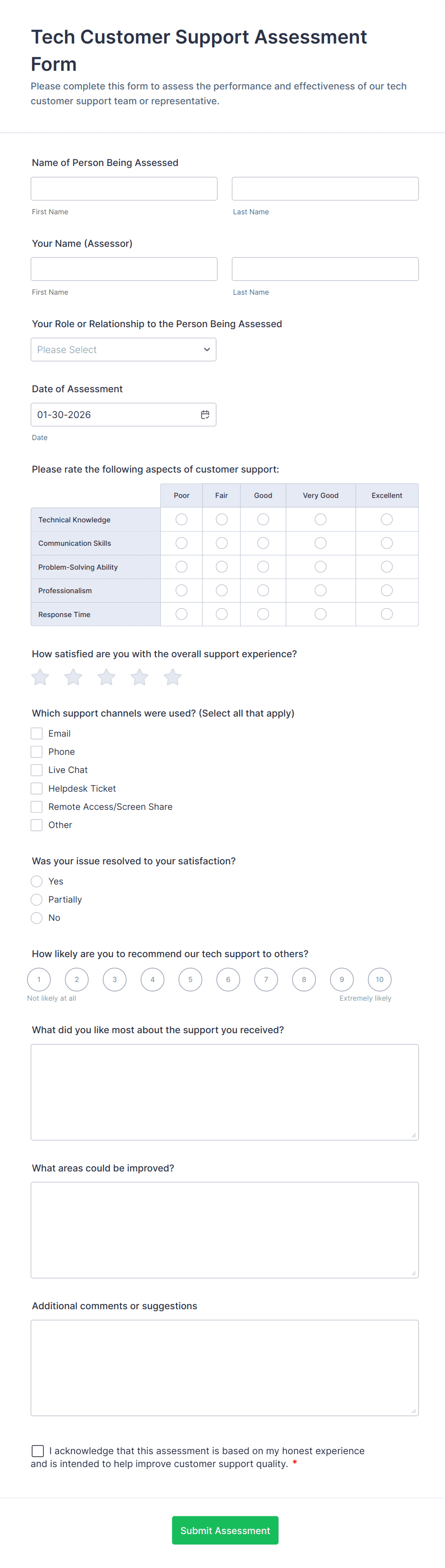 Assessment forms may include personal details, multiple-choice or open-ended questions, rating scales, comment sections, and sometimes automated scoring or feedback fields, depending on the purpose.