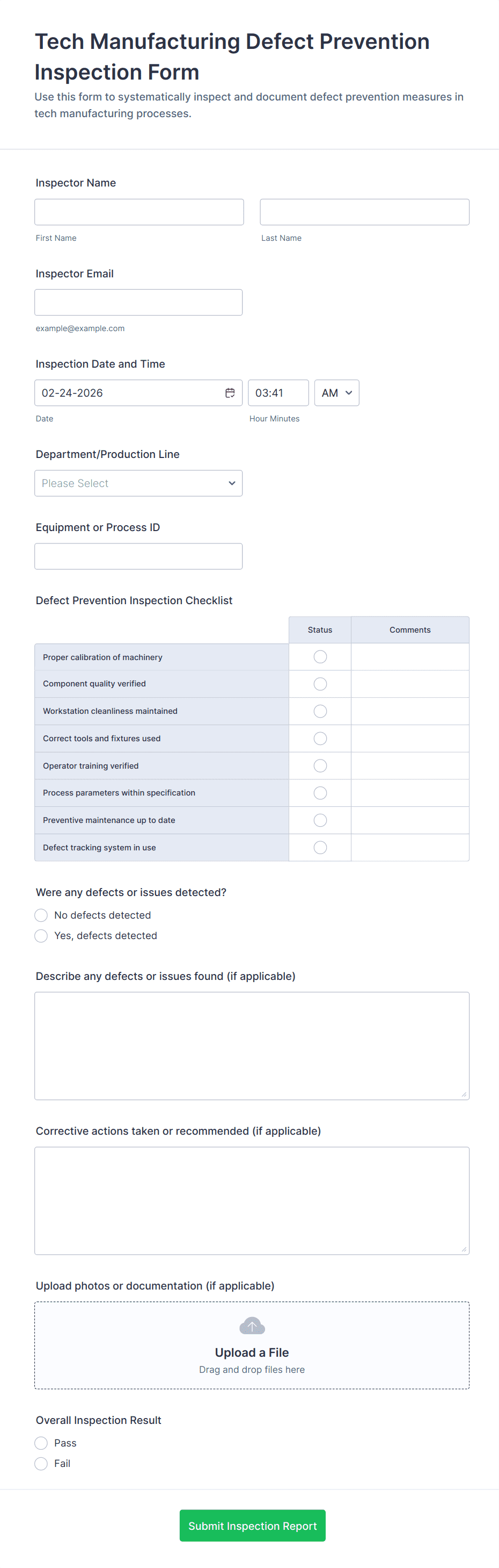 A manufacturing form is a digital or paper-based document used to collect, track, and manage data related to production, quality control, maintenance, inventory, and safety within a manufacturing environment.