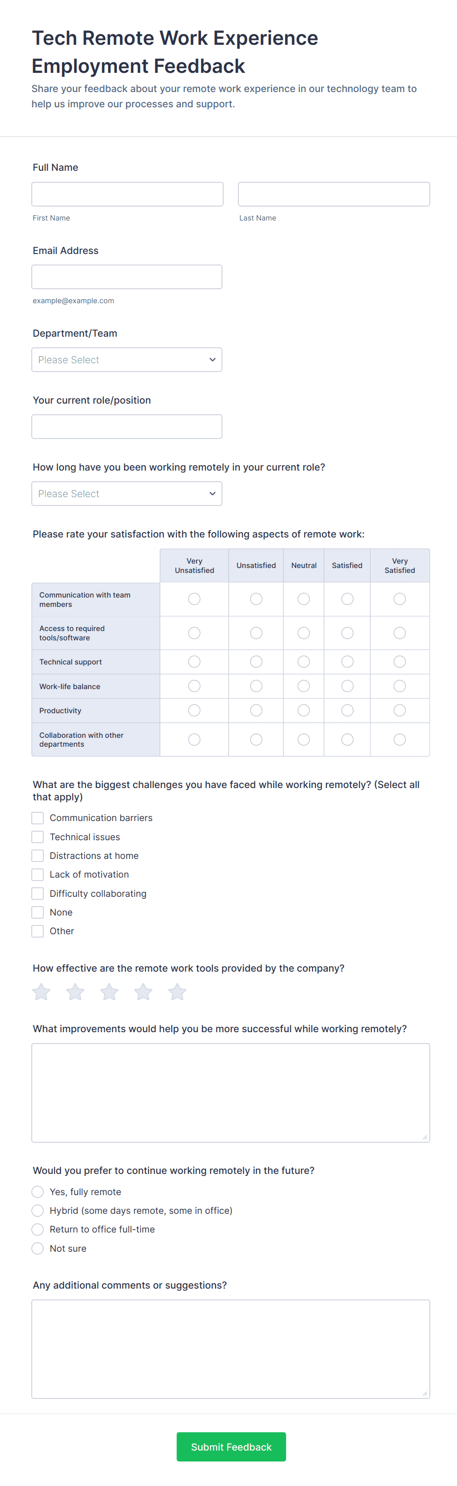 • For onboarding or exit surveys, add fields about the hiring process, training, or reasons for leaving.