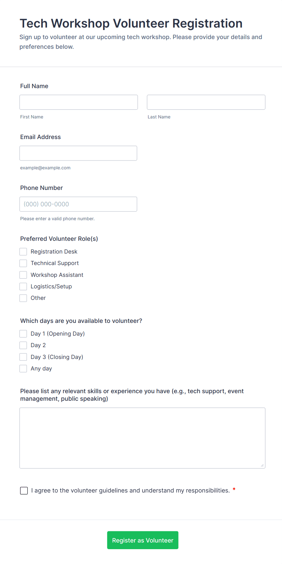 • Ongoing Program Enrollment: Nonprofits or community centers use forms to register volunteers for recurring programs, capturing long-term commitment and skill sets.