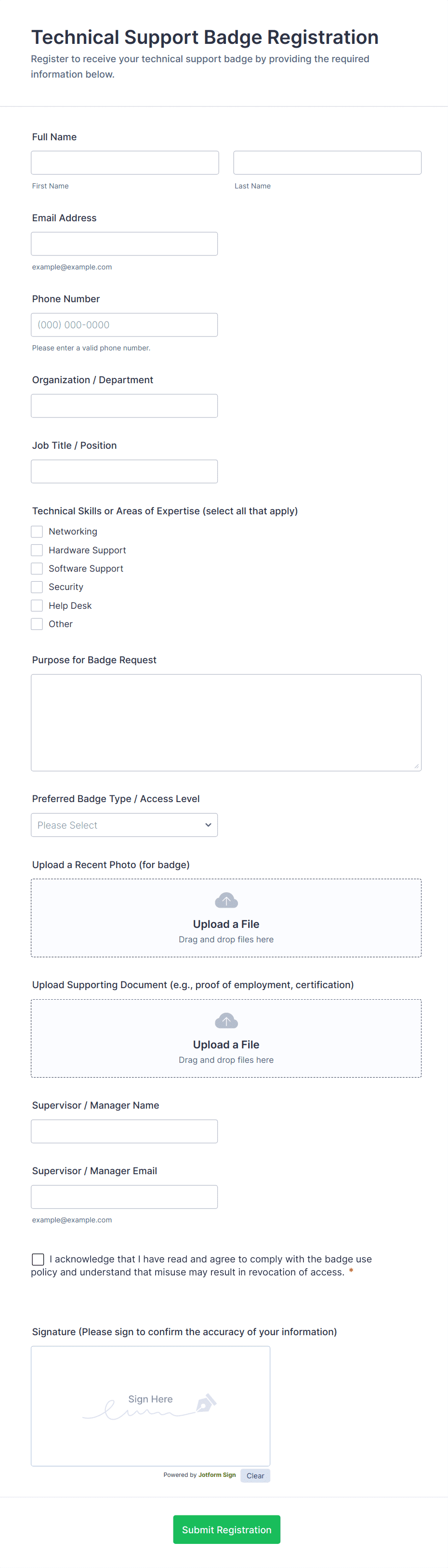 The Access Badge Check-In Form simplifies visitor management by collecting essential information for check-ins, enhancing security and organization for events and workplaces.
