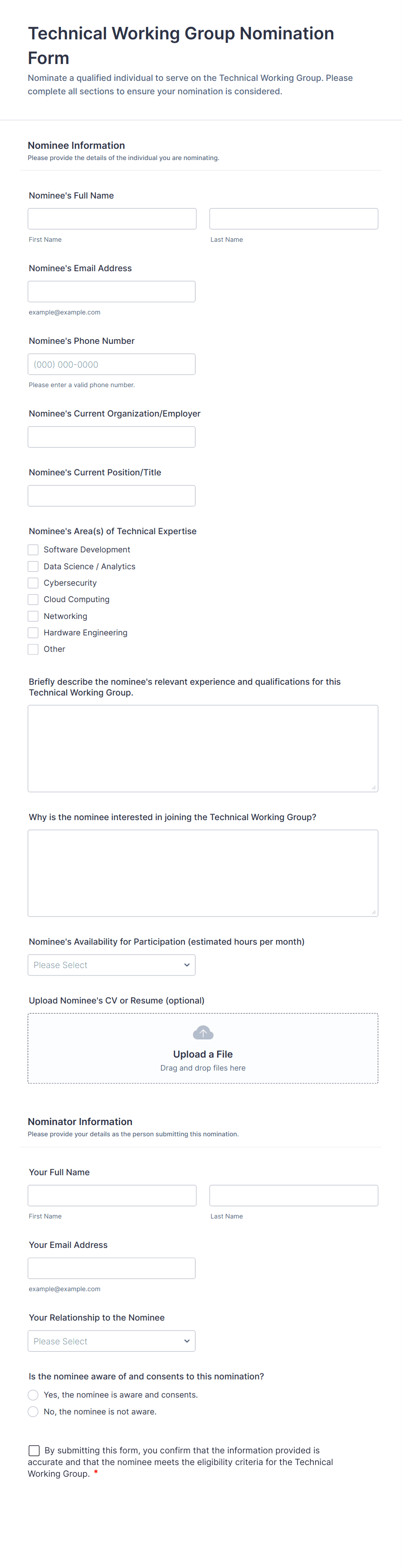 Collect nominee name, role or affiliation, and contact details if needed. Add nominator details and relationship to nominee.