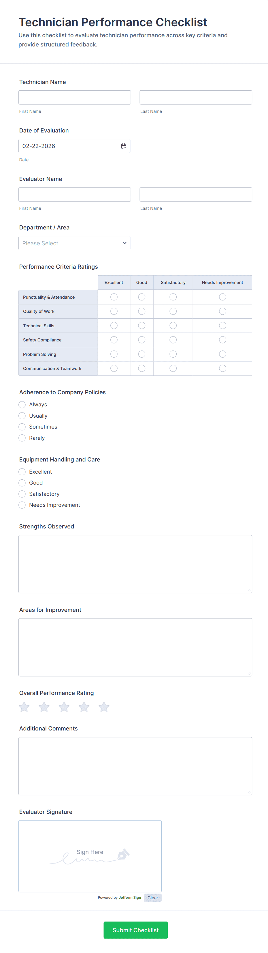 Start collecting online technician evaluations and requests with Jotform’s powerful Technician Forms. Choose from one of our readymade templates and customize it in seconds with Jotform’s intuitive form builder. You don’t need any coding knowledge to make changes — simply drag and drop to edit text fields and checklist items, install helpful widgets and integrations, choose fonts and colors, and more. Embed your form in a website or send email invites with just a few clicks. Respondents can then access and fill out your form from any device. Submissions are instantly synced and stored in your secure account, so can easily review your responses from one location. Survey your employees and fulfill client service requests with these fully-customizable Technician Forms.