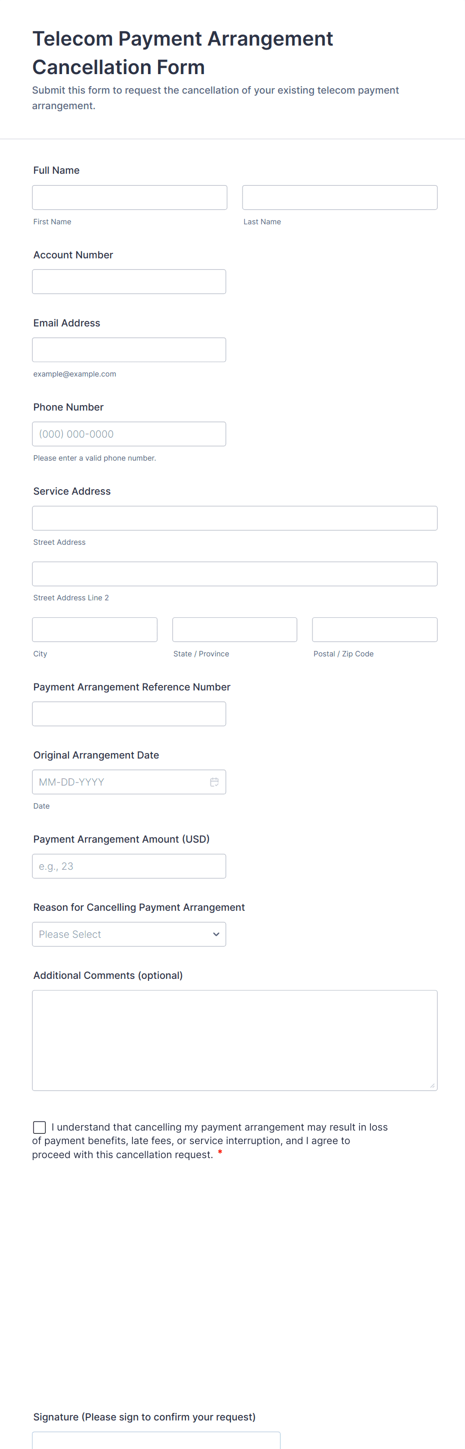 • For payment-related cancellations, include fields for refund preferences or payment details.