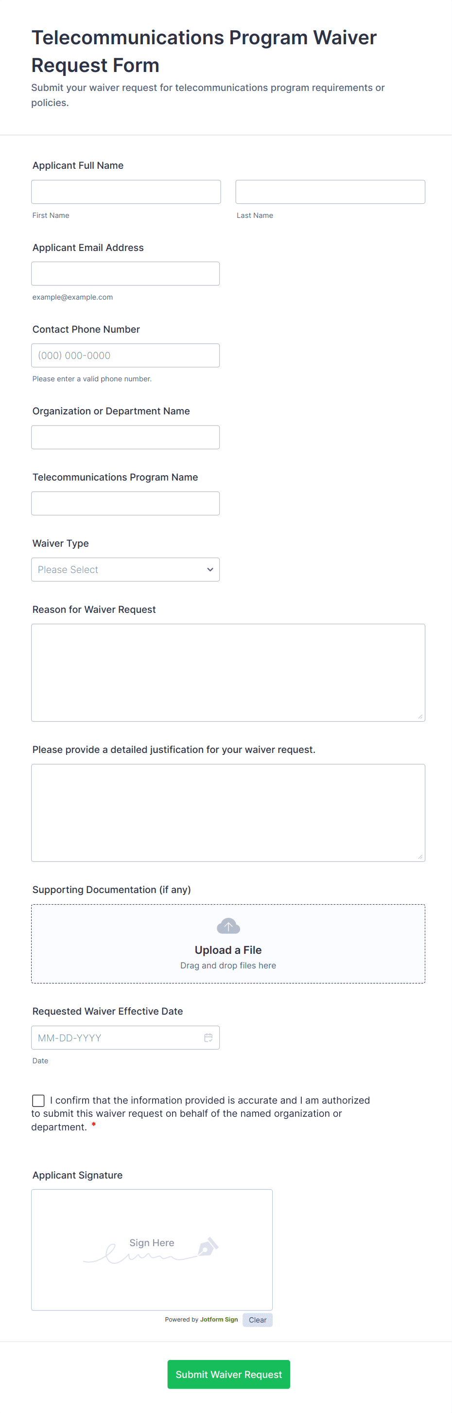Waiver forms are legal documents designed to obtain consent from individuals, releasing an organization or individual from liability for potential risks or damages associated with a specific activity, service, or event. Commonly used in industries such as fitness, sports, healthcare, education, and event management, waiver forms help protect businesses and organizations by ensuring participants acknowledge and accept the inherent risks involved. Use cases range from gym membership waivers and medical procedure consents to field trip permissions and event participation releases. By clearly outlining the terms and conditions, waiver forms help establish mutual understanding and safeguard both parties.