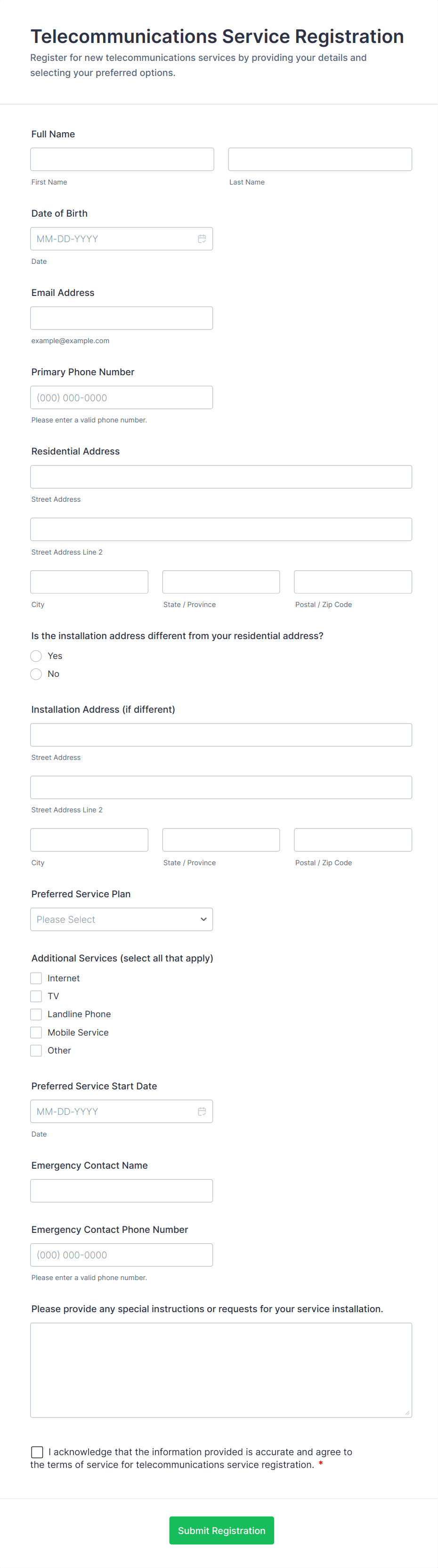 • For event or course registrations, include fields for session selection, preferences, or special requirements.