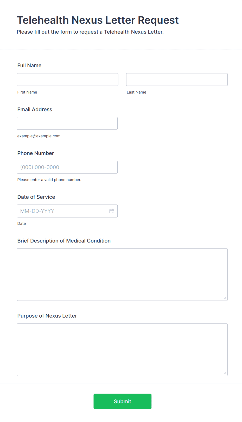 Telehealth forms are digital documents designed to facilitate remote healthcare services by enabling patients and providers to exchange essential information online. These forms can be used for a variety of purposes, including virtual appointment requests, patient intake, consent to telemedicine, symptom tracking, follow-up care, and remote prescription renewals. By digitizing these processes, telehealth forms help healthcare professionals gather accurate patient data, streamline administrative workflows, and ensure compliance with healthcare regulations—all without the need for in-person visits. Typical users include clinics, hospitals, private practices, mental health professionals, and allied health providers who offer virtual care.