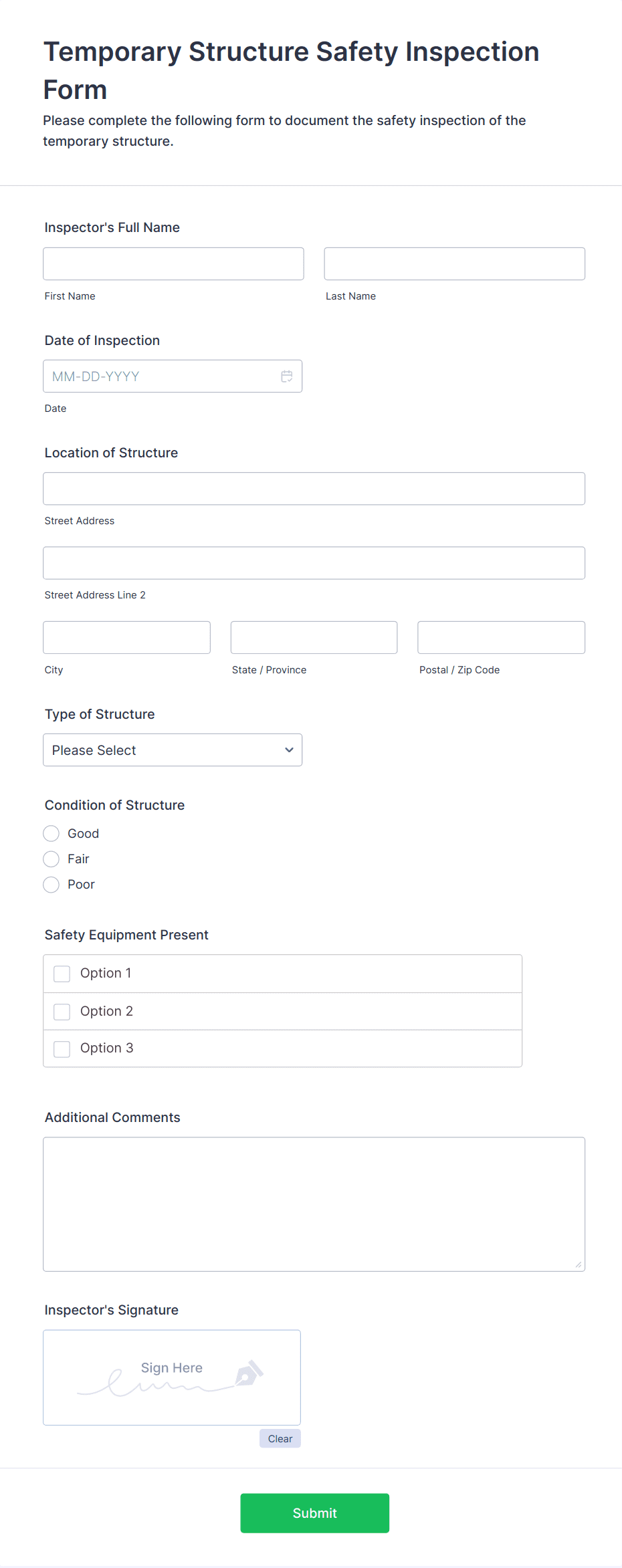 By following these steps, you can create a comprehensive Safety Inspection Form that streamlines your inspection process, enhances compliance, and supports a safer work environment.