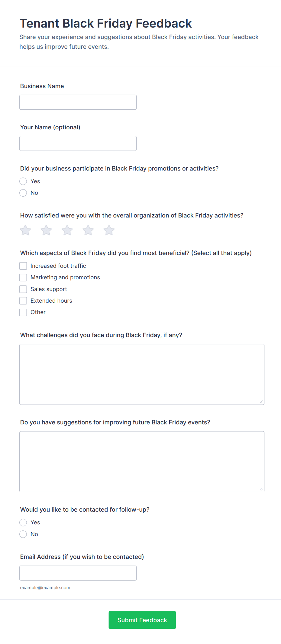 A Black Friday Form Template is a pre-designed online form used to manage various activities during Black Friday, such as registrations, orders, event RSVPs, feedback collection, and contests.
