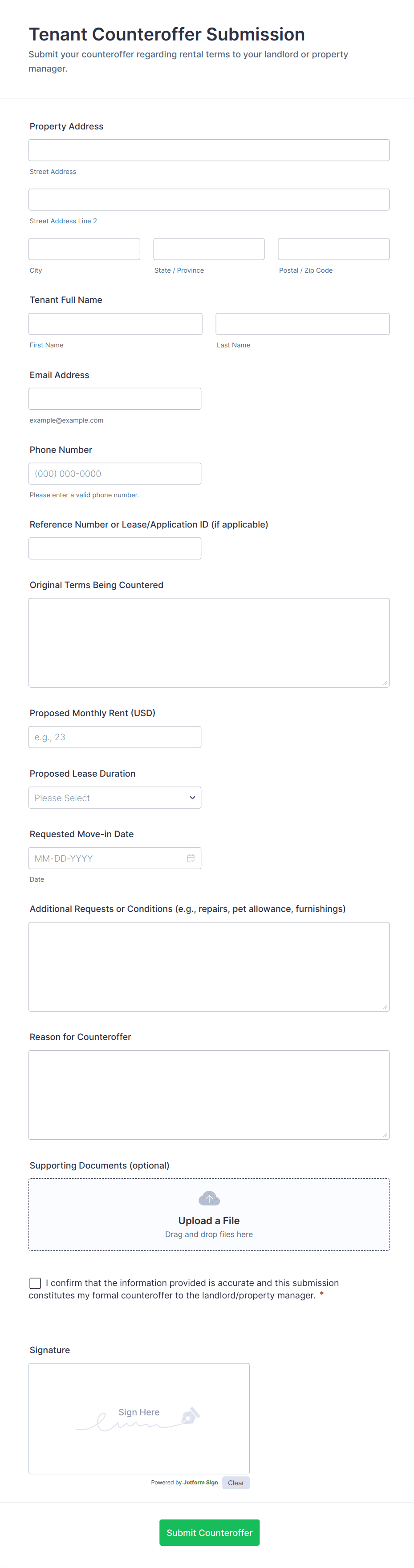 The form templates here are for informational purposes only. Jotform is not providing legal, financial, or other advice, or implying that the forms are legally valid in all or any jurisdictions. Before using any such form, consult an attorney and/or other applicable professionals to make sure that the form meets your needs, legally and otherwise.
