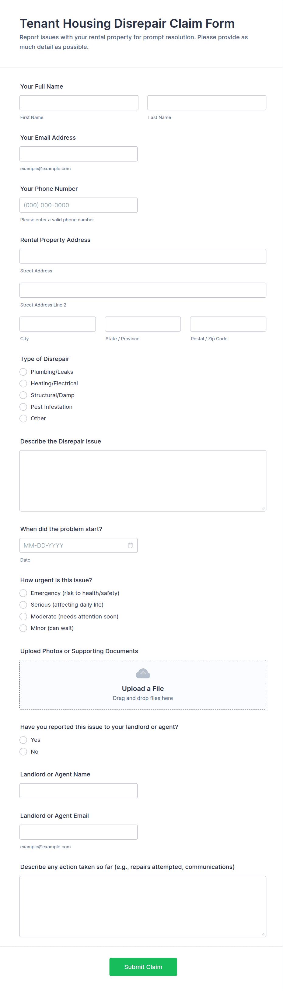 • Maintenance Requests: Tenant name, unit number, issue description, urgency level, file upload for photos.