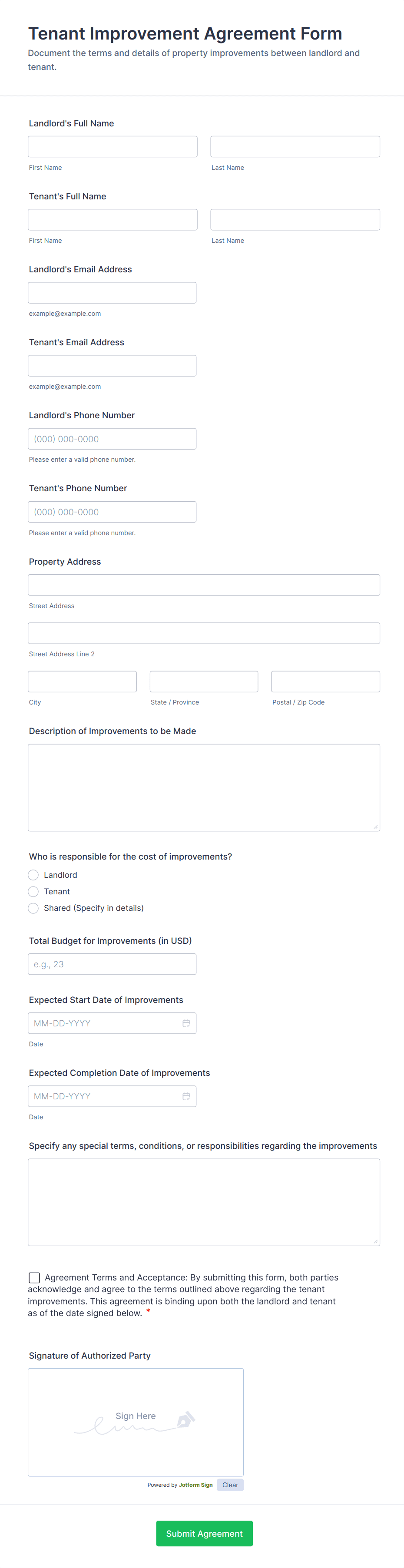 The form templates here are for informational purposes only. Jotform is not providing legal, financial, or other advice, or implying that the forms are legally valid in all or any jurisdictions. Before using any such form, consult an attorney and/or other applicable professionals to make sure that the form meets your needs, legally and otherwise.