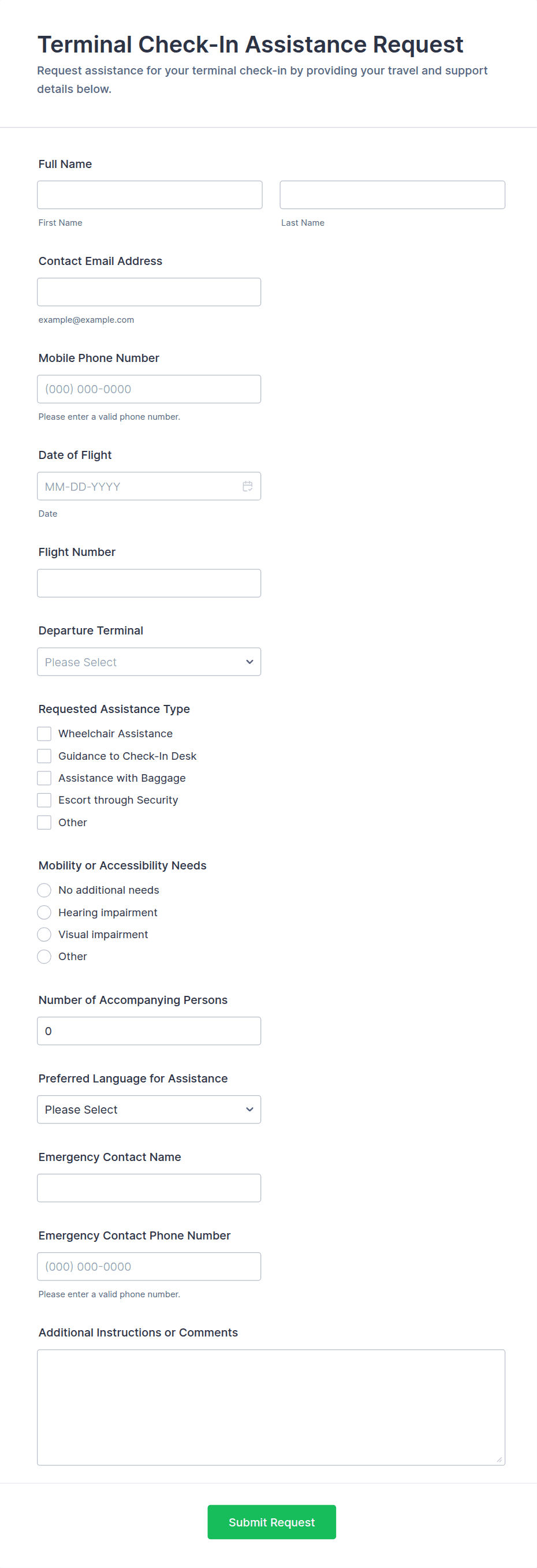 • Special request or notes section for additional needs (e.g., wheelchair access).
