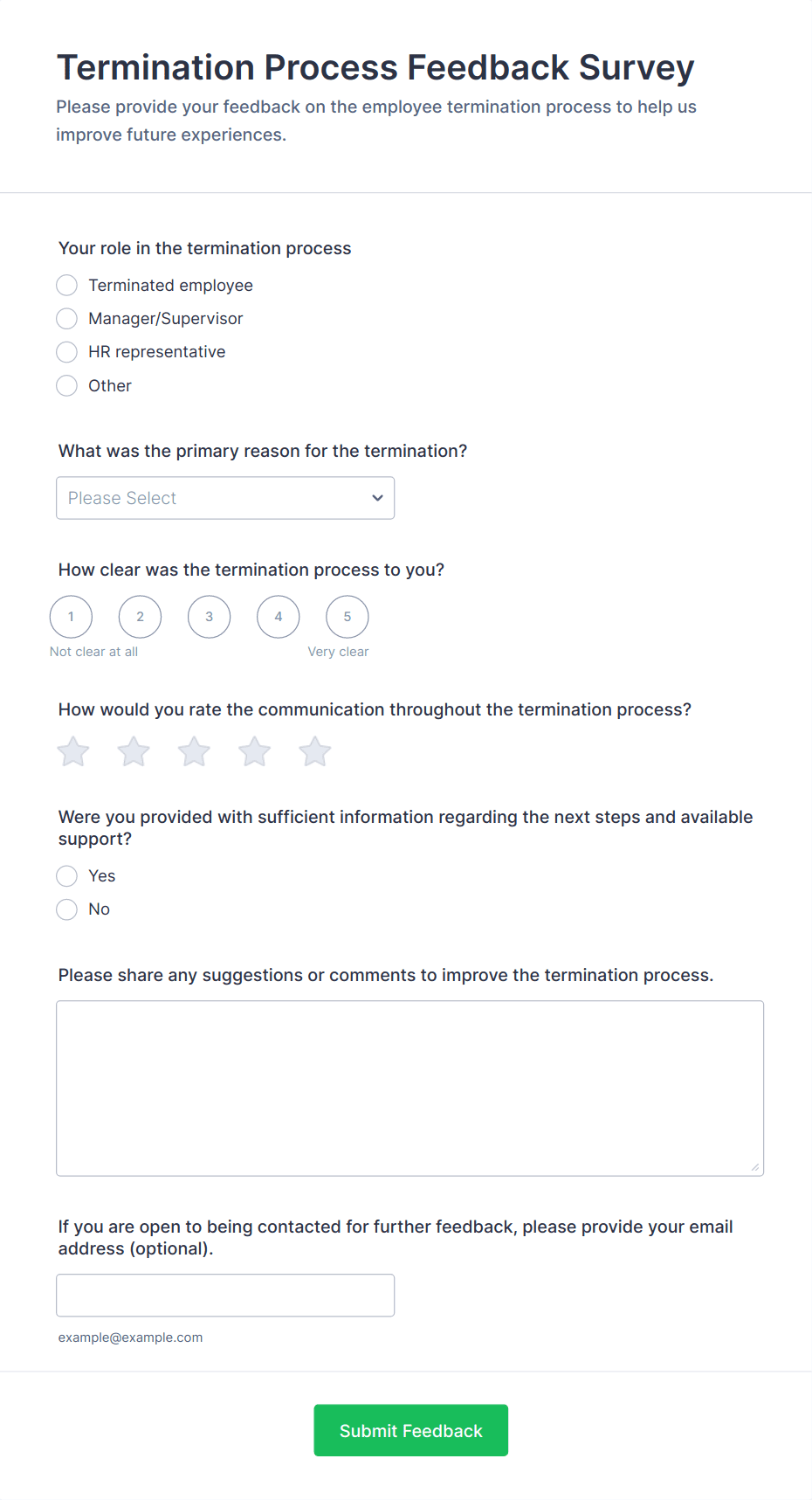 Gather feedback online from outgoing employees to ensure a smoother resignation transition and improve your company. Easy to customize and embed.