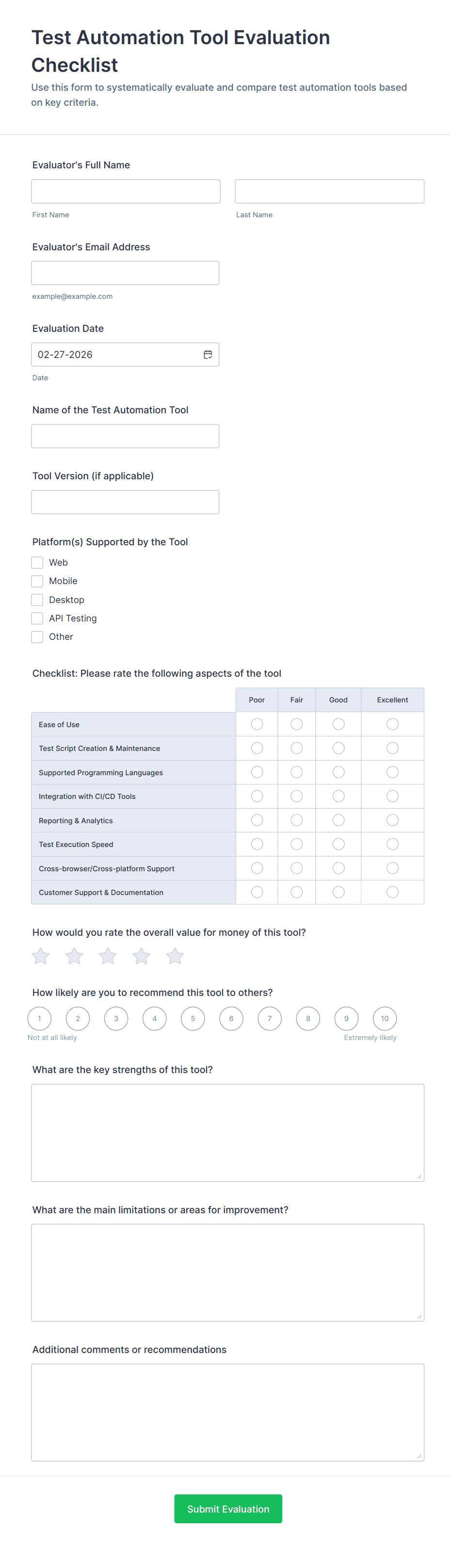 • For more complex checklists, add dropdowns, file upload fields (for attaching evidence or reports), or signature fields (for verification).