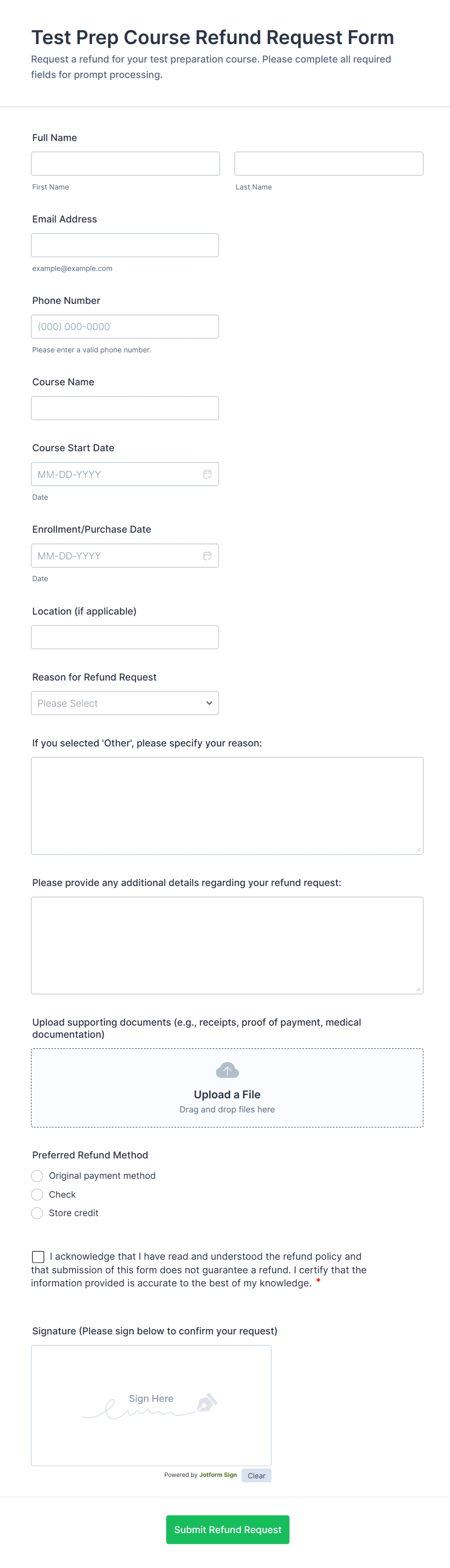 Refund Form Templates are specialized online forms designed to streamline the process of requesting, processing, and managing refunds across a variety of industries. Whether you’re running an e-commerce store, a service-based business, an event organization, or a school, refund forms help you collect all the necessary information from customers or clients who wish to request a refund. These templates typically include fields for order details, reasons for the refund, payment information, and supporting documentation, ensuring that refund requests are handled efficiently and transparently. Use cases range from product returns and event ticket refunds to tuition reimbursements and subscription cancellations.