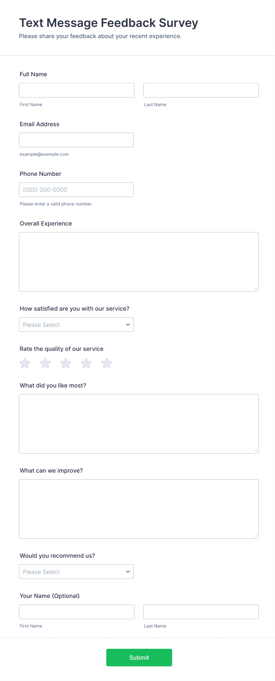 • For customer feedback, include questions about satisfaction, product quality, and likelihood to recommend.