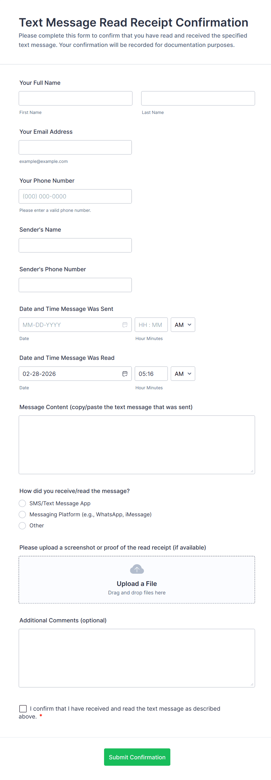 Confirmation Form Templates are specialized online forms designed to capture and verify user consent, agreement, or acknowledgment for a wide range of scenarios. These templates are commonly used to confirm event attendance, order details, appointment bookings, policy acceptance, or receipt of information. By providing a structured way for users to confirm their participation or understanding, these forms help organizations ensure clarity, reduce misunderstandings, and maintain accurate records. Whether you’re managing RSVPs for an event, confirming service appointments, or collecting digital signatures for policy agreements, confirmation forms streamline the process and provide a clear audit trail.