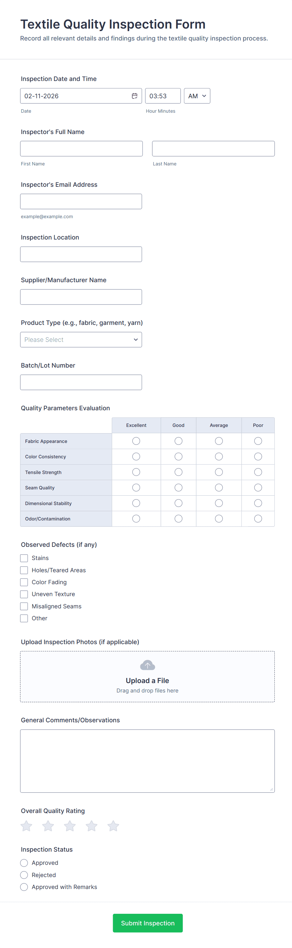 An inspection form is a structured document used to assess, record, and report the condition, compliance, or quality of assets, environments, or processes during an inspection.