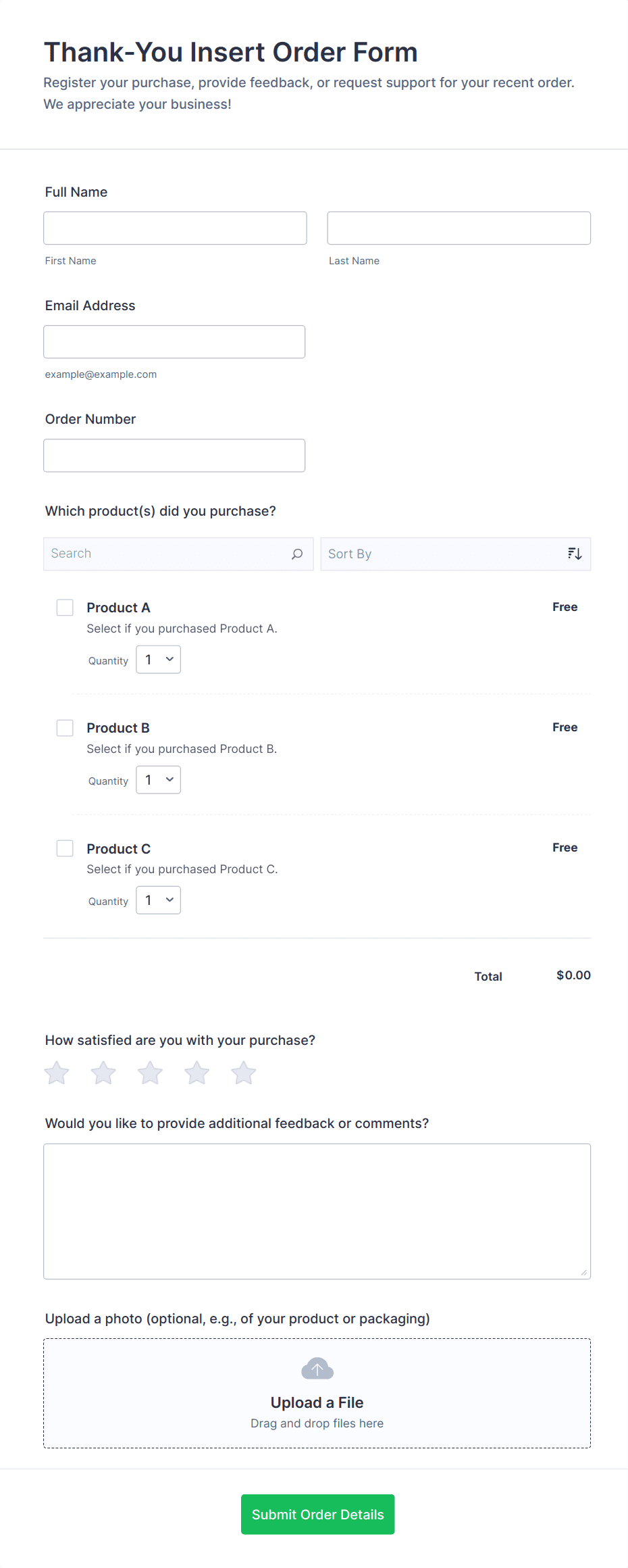 Sell anything online with this free Product Order Form. Customize and embed in your website in seconds. Integrate with 130+ apps. Collect payments online.