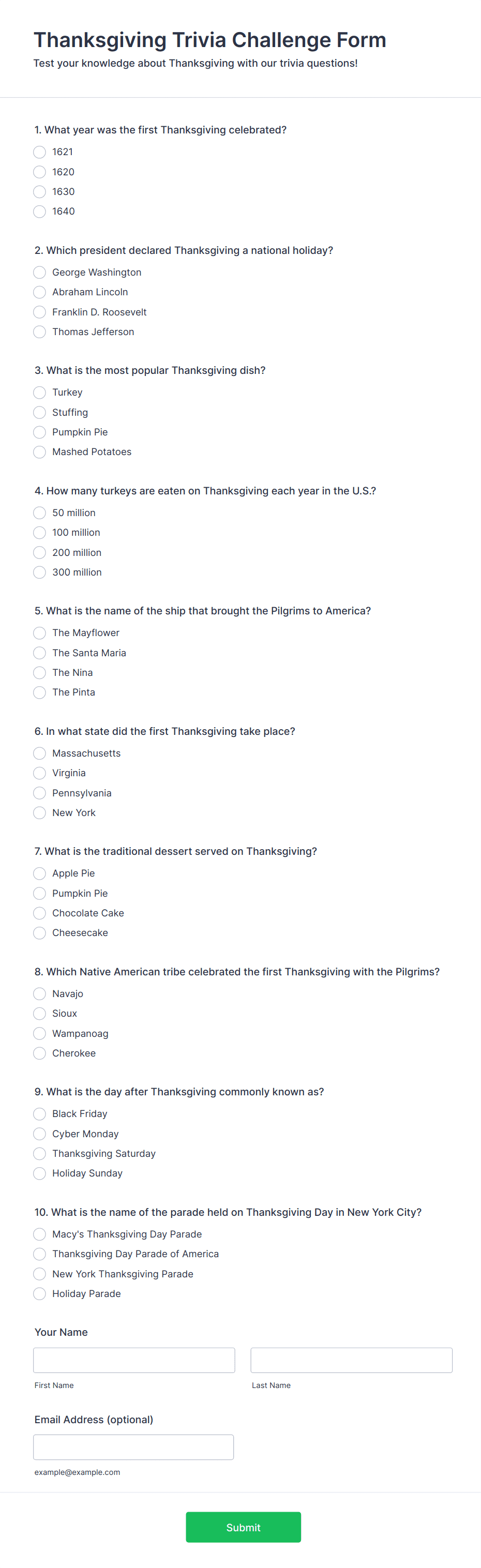 A Trivia Quiz Form is a versatile tool that can be adapted to various contexts and objectives, serving as a fun, interactive, and engaging way to entertain, educate, and connect with audiences.
