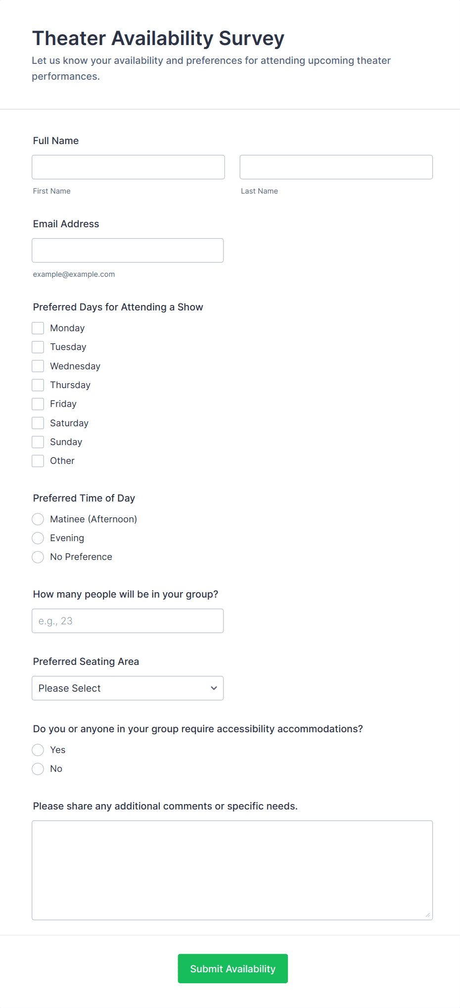 • For virtual events, include questions about technology, accessibility, and online engagement.
