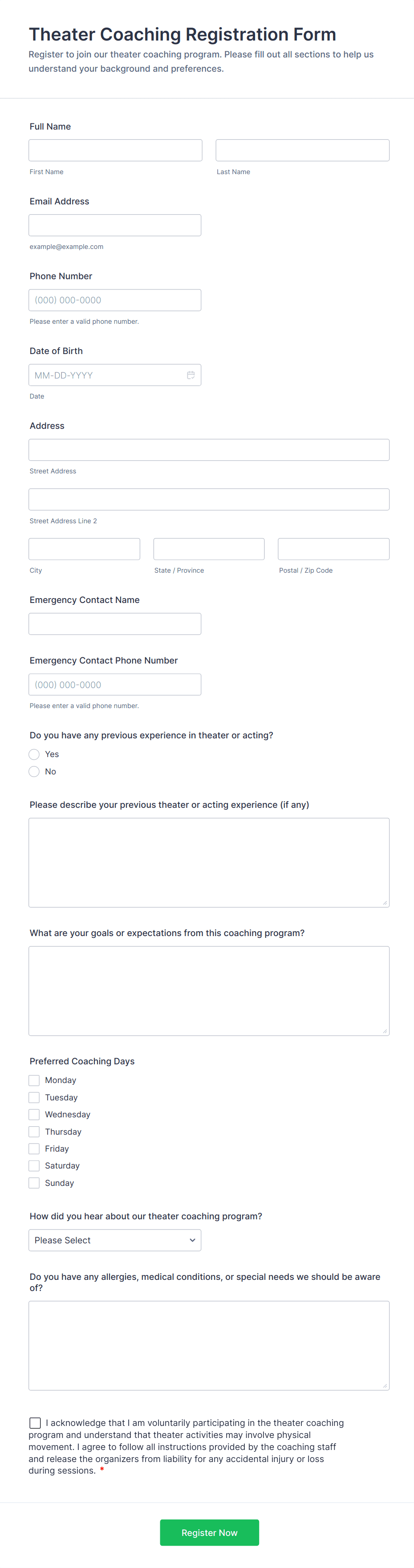 A coaching registration form is a questionnaire used to enroll people in sports or fitness classes and programs.