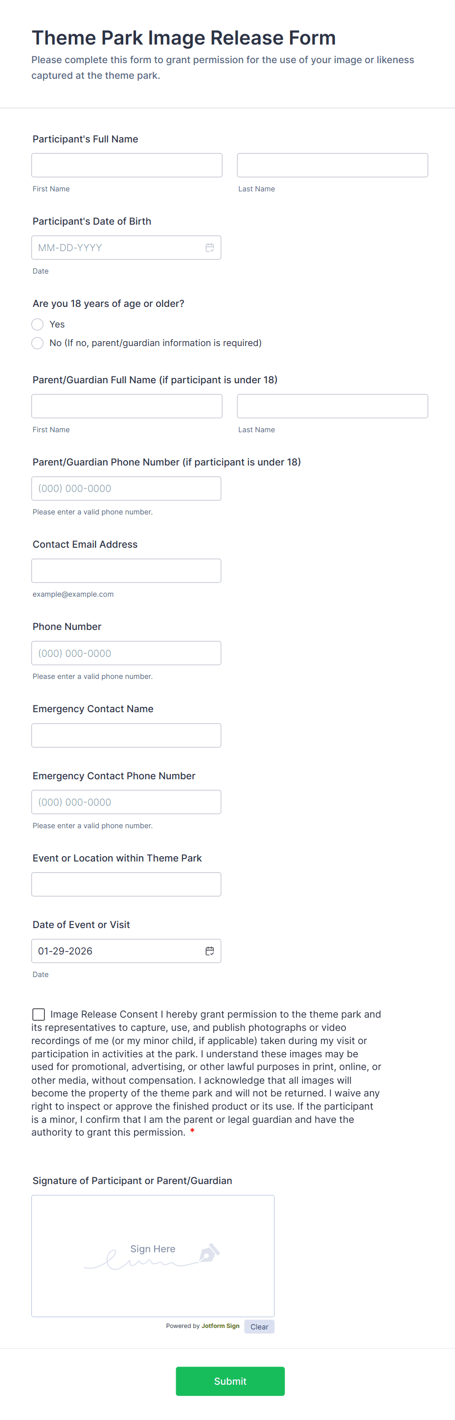 • For minors, include additional fields for parent/guardian details and signature.