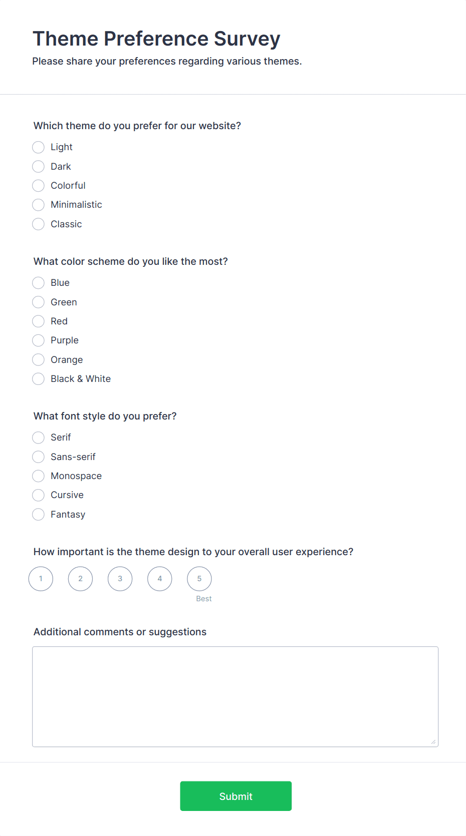 Survey templates are pre-designed forms that help individuals and organizations collect feedback, opinions, or data from a target audience. These templates are widely used for a variety of purposes, such as customer satisfaction surveys, employee engagement assessments, market research, event feedback, and academic studies. By providing a structured set of questions, survey templates streamline the process of gathering valuable insights, making it easier to analyze trends, measure satisfaction, and make informed decisions. Whether you’re a business owner, HR professional, educator, or researcher, survey templates offer a quick and effective way to reach your audience and collect actionable information.