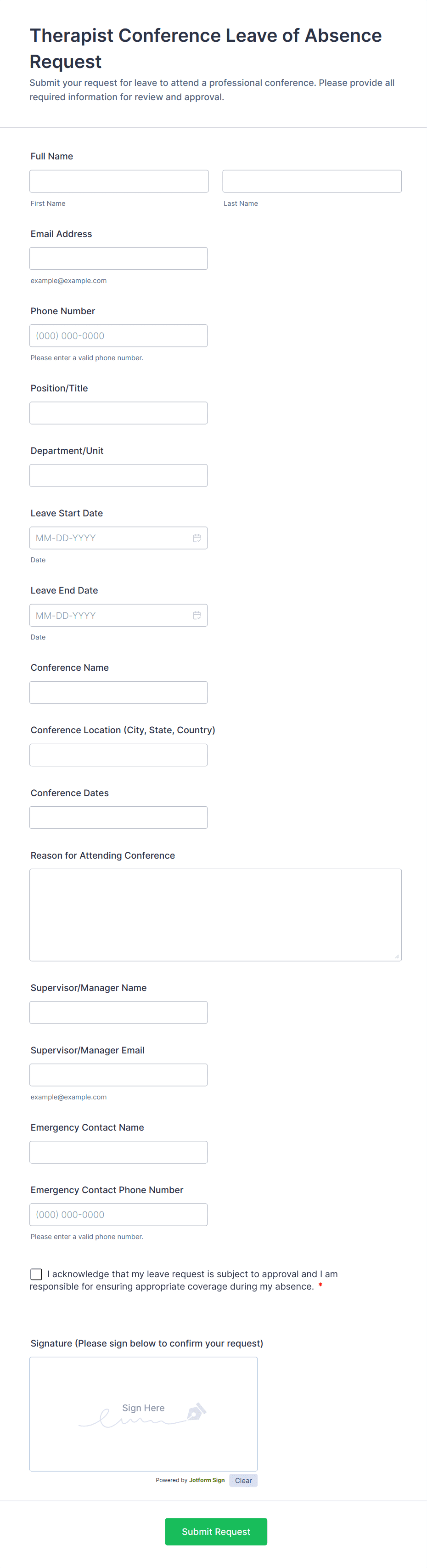 Leave Request Form Templates are digital forms designed to streamline the process of requesting and managing employee absences within organizations. These templates are commonly used by HR departments, team leaders, and managers to collect essential information from employees who need to take time off for reasons such as vacation, sick leave, personal days, parental leave, or other special circumstances. By standardizing the leave request process, these forms help ensure that all necessary details—such as dates, type of leave, reason for absence, and approval status—are captured efficiently and consistently. Use cases range from small businesses tracking vacation days to large enterprises managing complex leave policies across multiple departments.