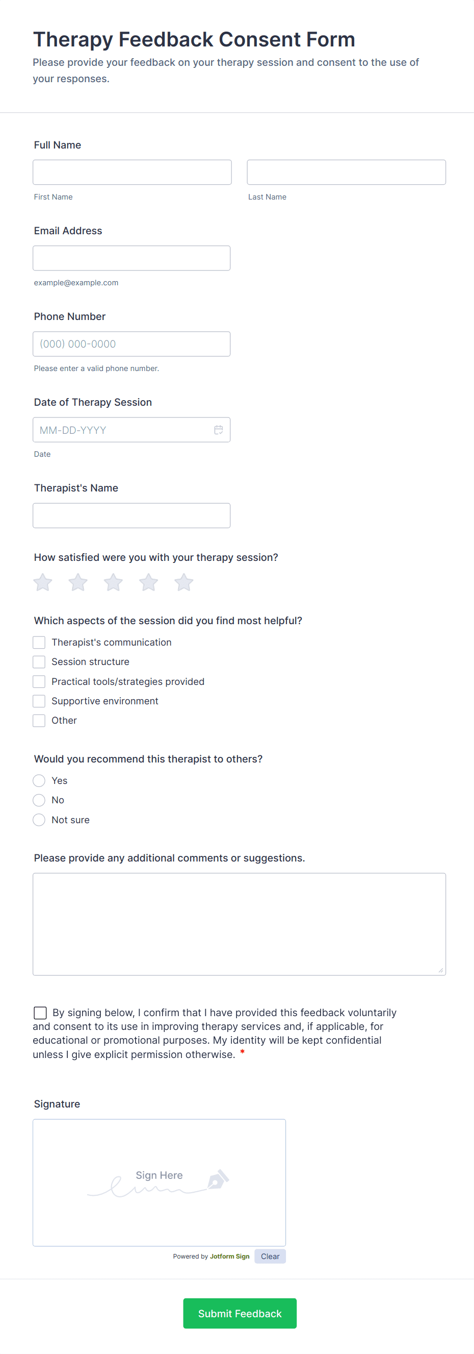 Include required checkboxes for consent, confidentiality acknowledgments, and preferred communication methods. This helps set expectations and supports ethical and professional standards.