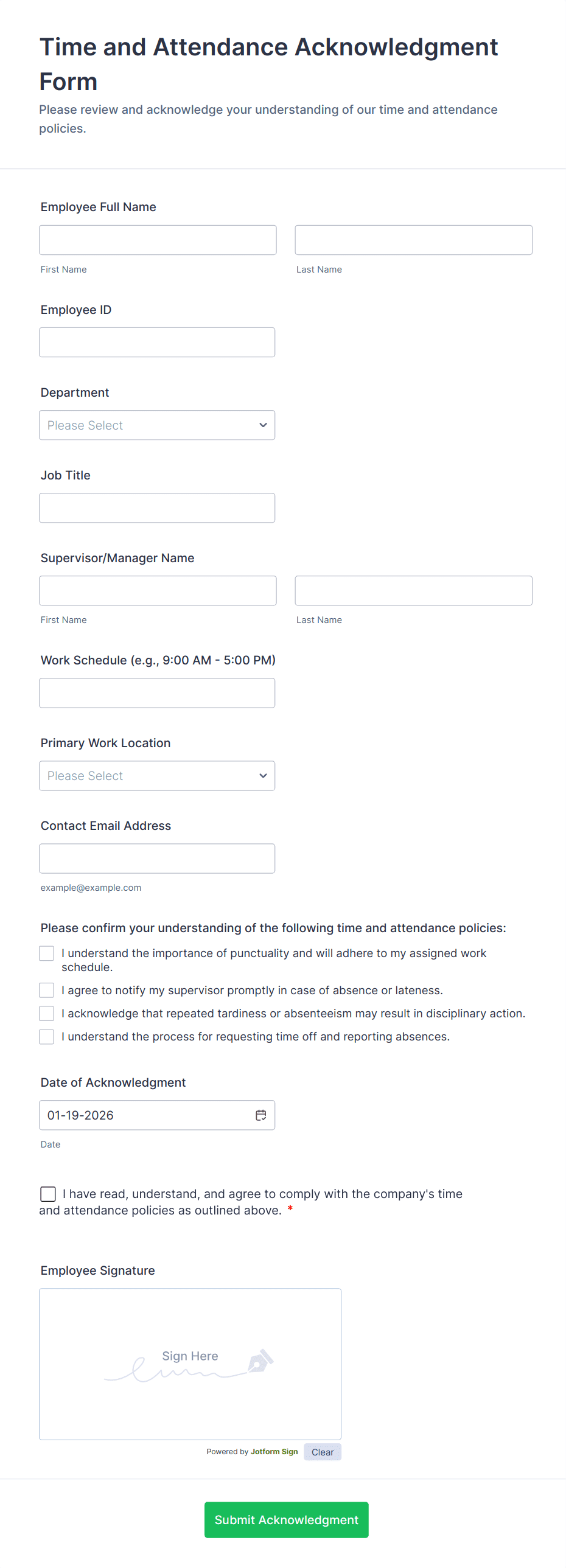 An Employee Attendance Form is a form template designed to streamline the process of monitoring attendance within organizations.
