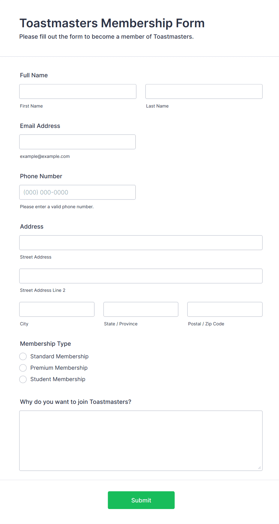 A membership registration form is used by organizations to collect information from potential members. With a free membership registration form, you can collect contact information from your potential members on your website!