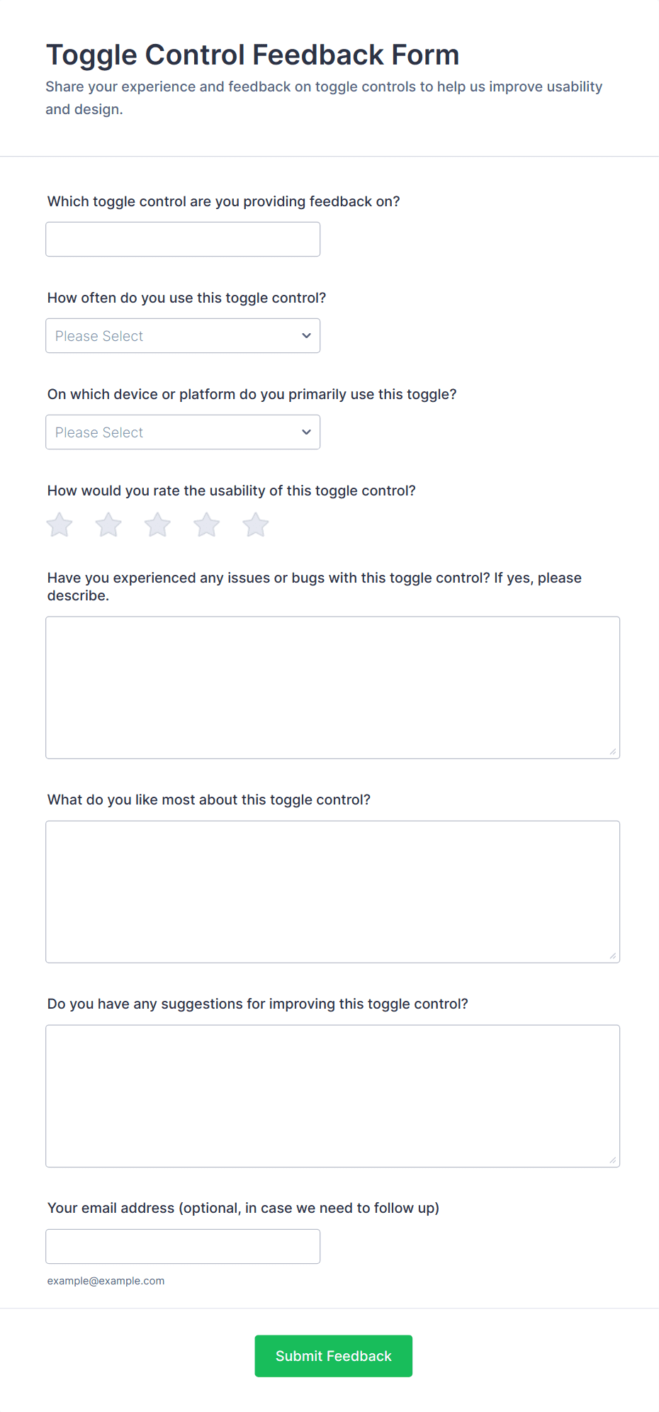 • Product feedback forms may include questions about usability, features, and likelihood to recommend.