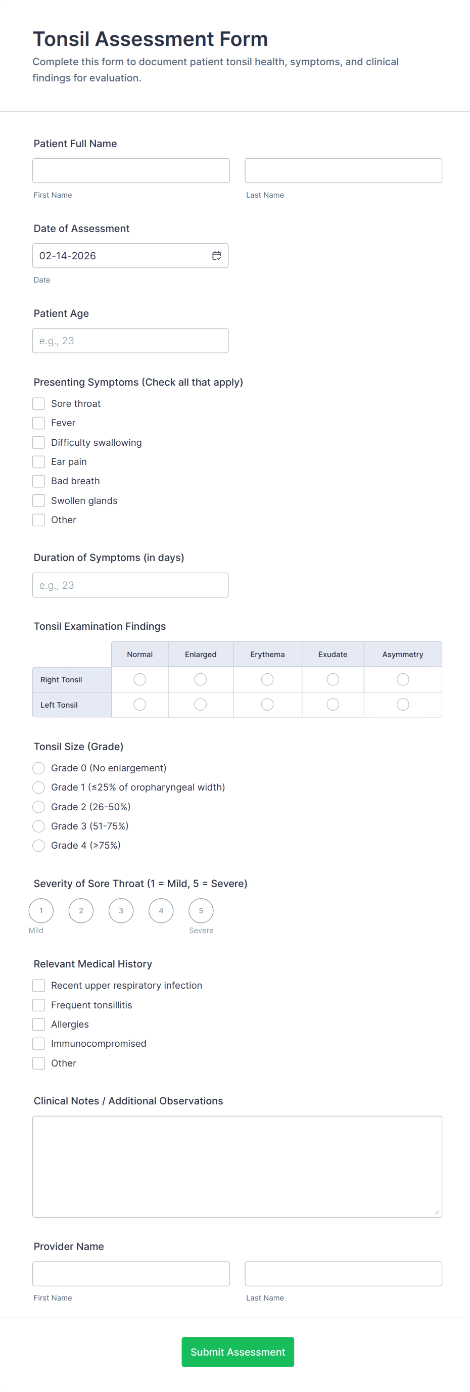 Add fields for symptoms, medical history, medications, allergies, lifestyle factors, and functional status depending on the assessment type. Use rating scales for severity and impact.