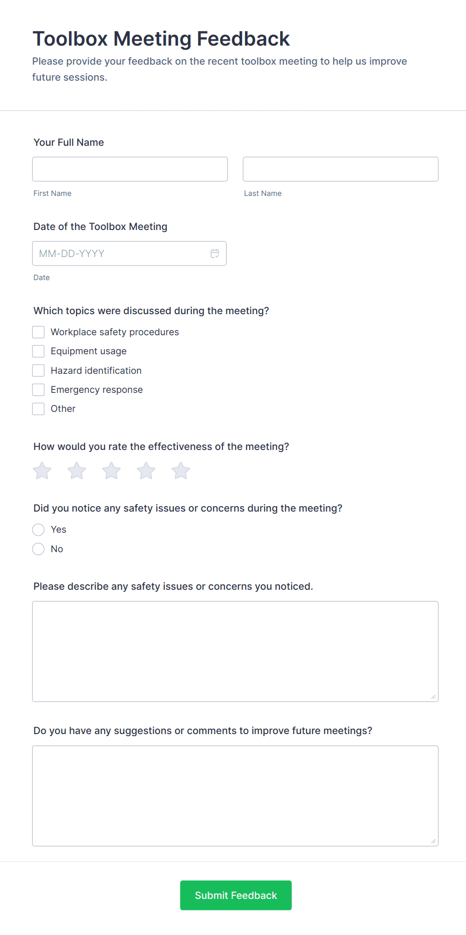 A meeting form is an online tool used to organize, schedule, and manage meetings by collecting essential information such as attendee details, agenda items, and feedback.