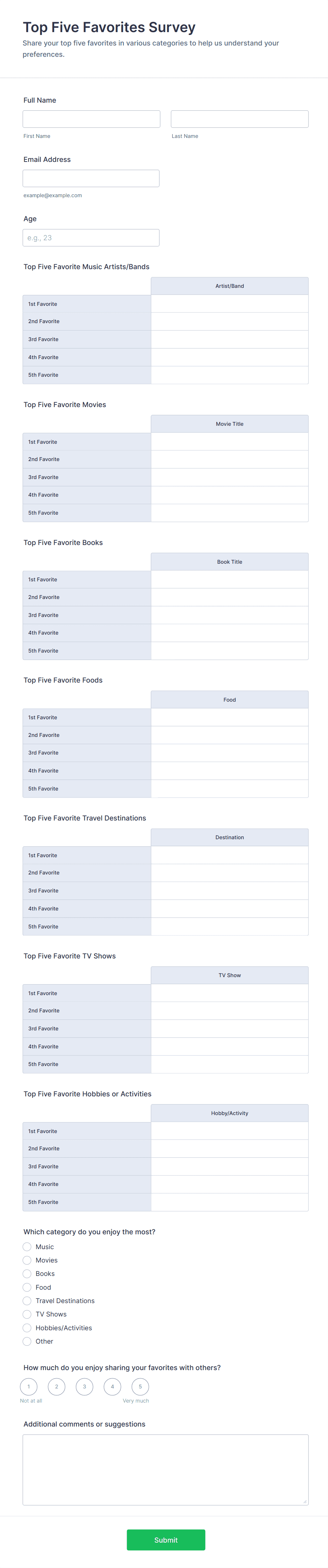 A My Favorite Things Questionnaire is a form template designed for teachers and individuals to gather insights about students' preferences and interests.