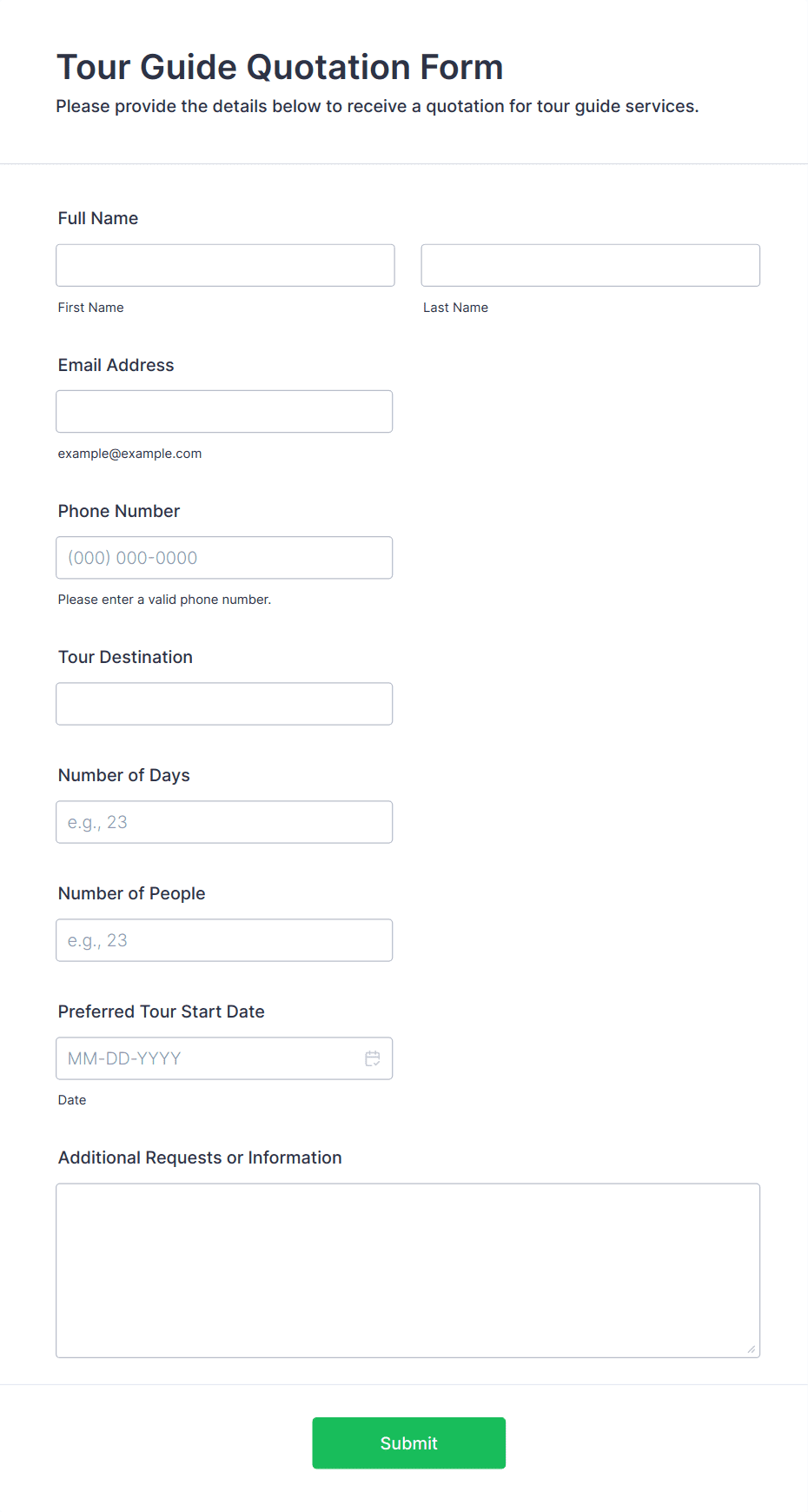 A simple form template which allows customers to submit their booking inquiry or any other comment with their contact information that would allow you to conveniently respond your customers to confirm the booking availability.