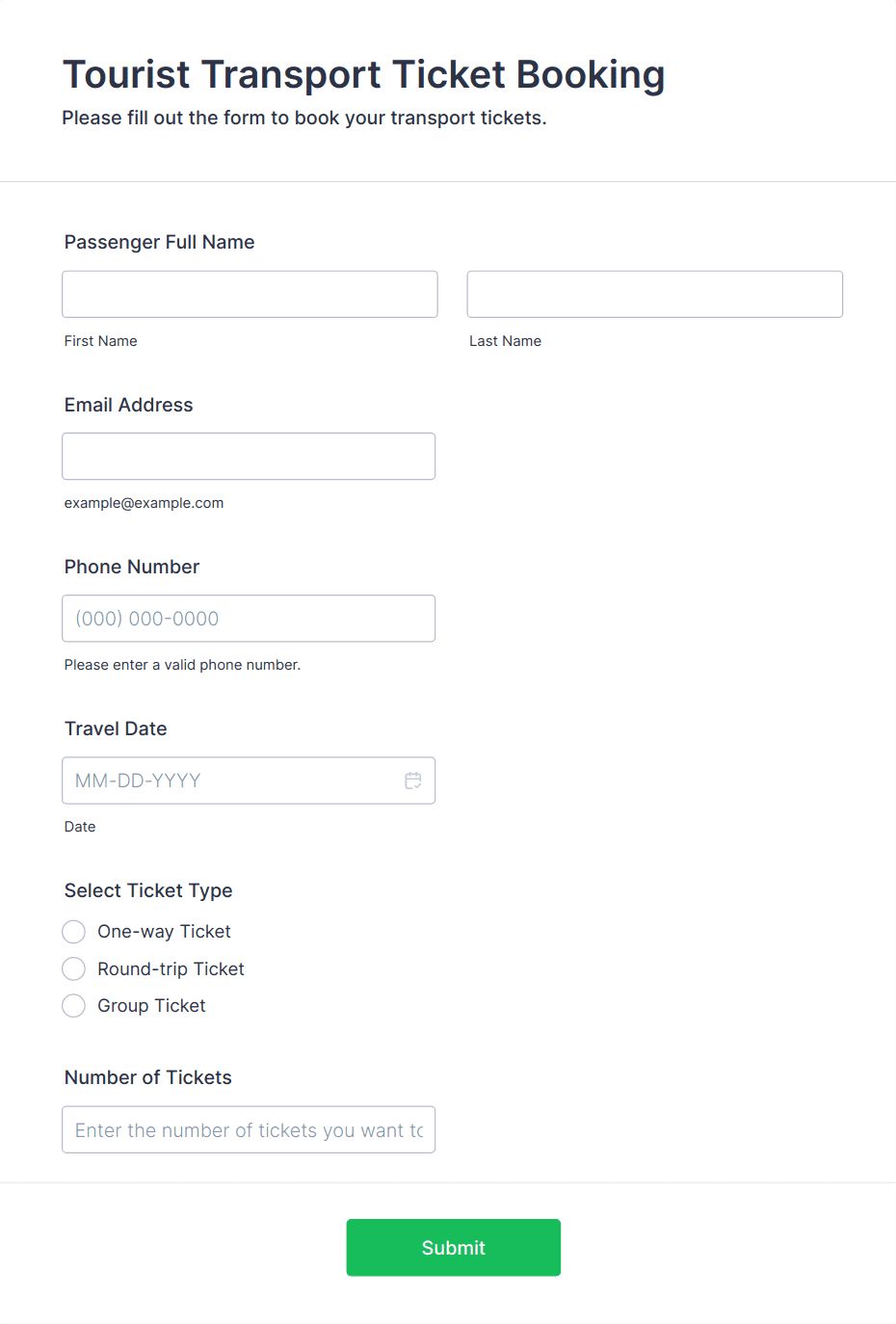 A simple form template which allows customers to submit their booking inquiry or any other comment with their contact information that would allow you to conveniently respond your customers to confirm the booking availability.