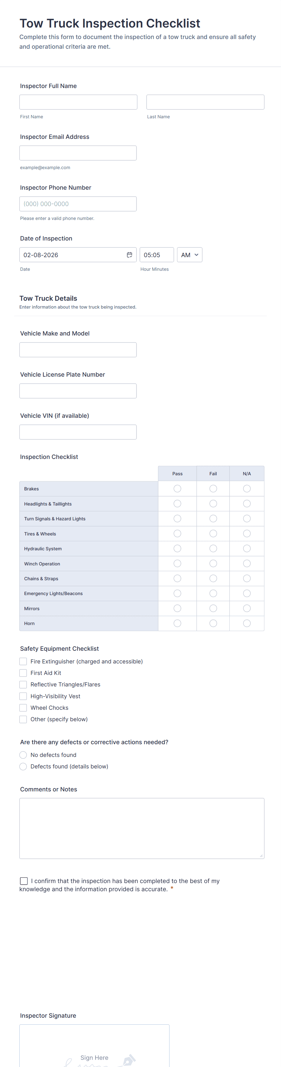 - Signature fields for inspector and/or vehicle owner