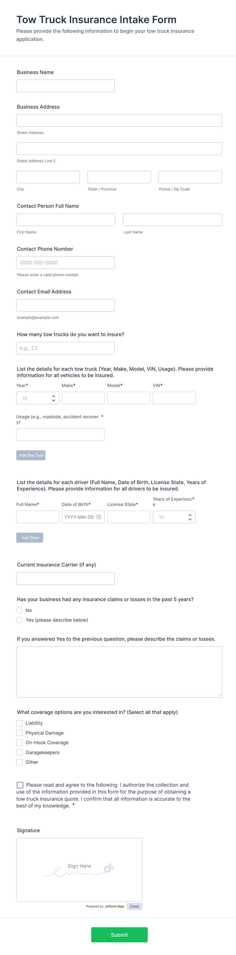 The form templates here are for informational purposes only. Jotform is not providing legal, financial, or other advice, or implying that the forms are legally valid in all or any jurisdictions. Before using any such form, consult an attorney and/or other applicable professionals to make sure that the form meets your needs, legally and otherwise.